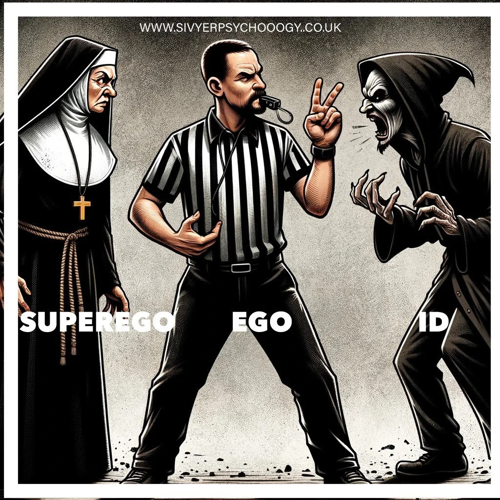 Conflicts between these components—such as the id’s desires clashing with the superego’s moral standards—are managed by the ego through defence mechanisms like repression, displacement, and sublimation.