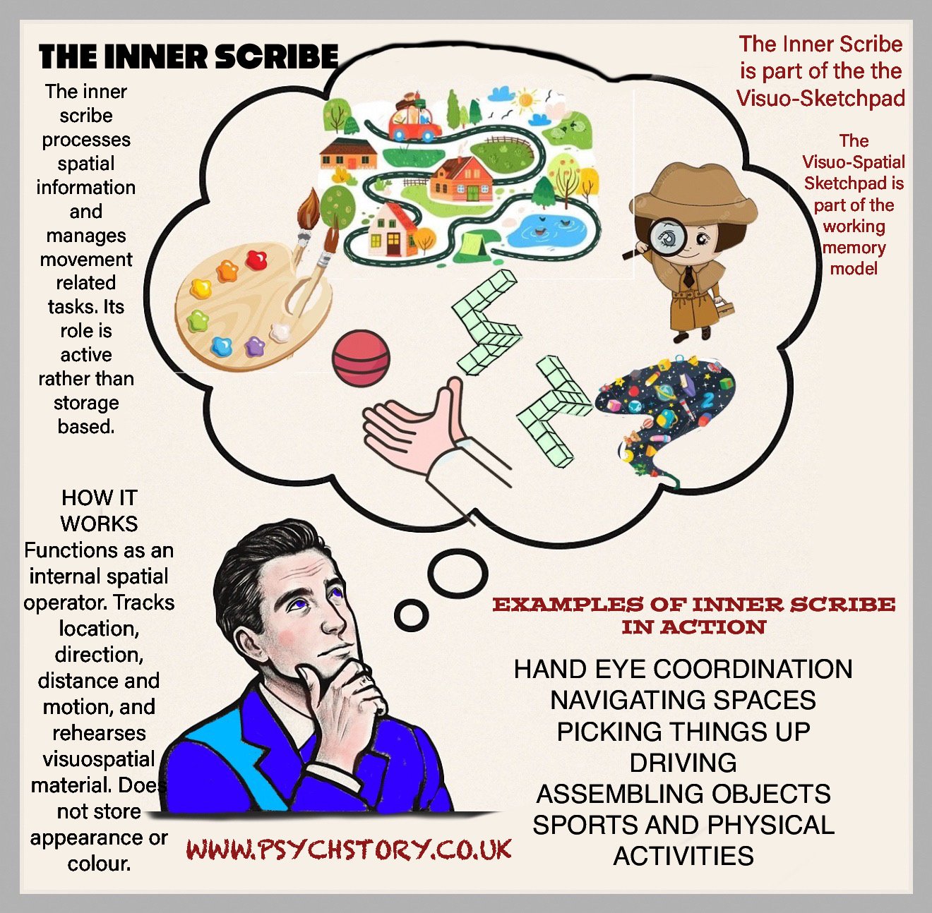 "Working memory is our mental workspace, enabling us to hold and manipulate information in real time. The phonological loop acts like an audio player, storing and rehearsing sounds to help us remember a phone number or shopping list. Meanwhile, the visuospatial sketchpad, our mind’s eye, creates mental maps and visualises layouts—like navigating a dark room or picturing landmarks in our neighbourhood. Overseeing the system, the central executive allocates attention, ensuring that tasks are managed efficiently. Together, these components allow us to solve problems, follow conversations, and navigate daily life, making working memory vital from childhood to old age."