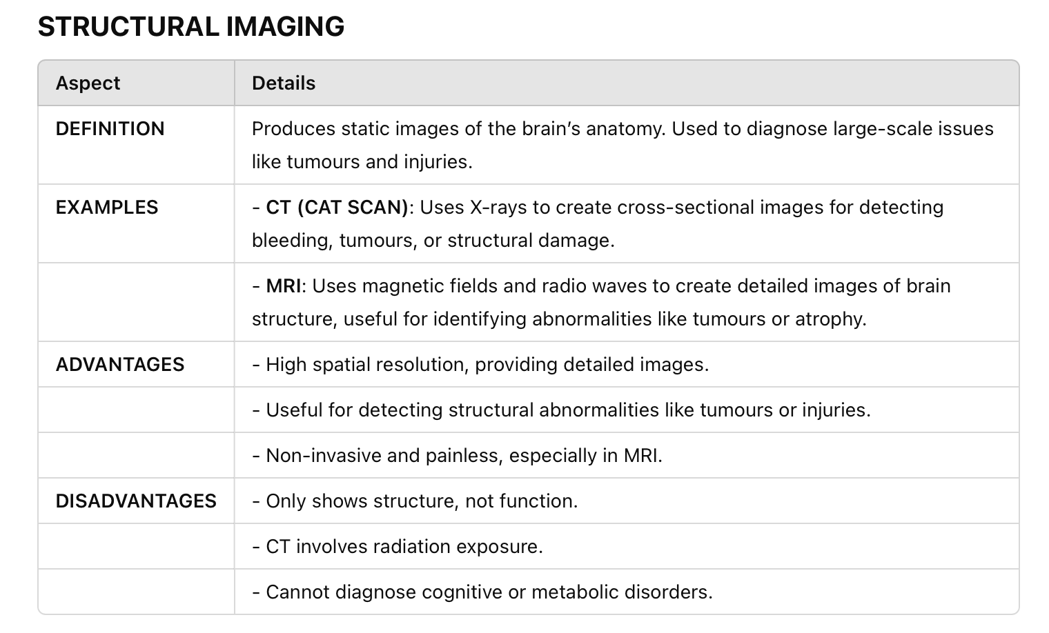 Disadvantages: It cannot show brain function or activity, and some techniques (CT) involve radiation exposure.