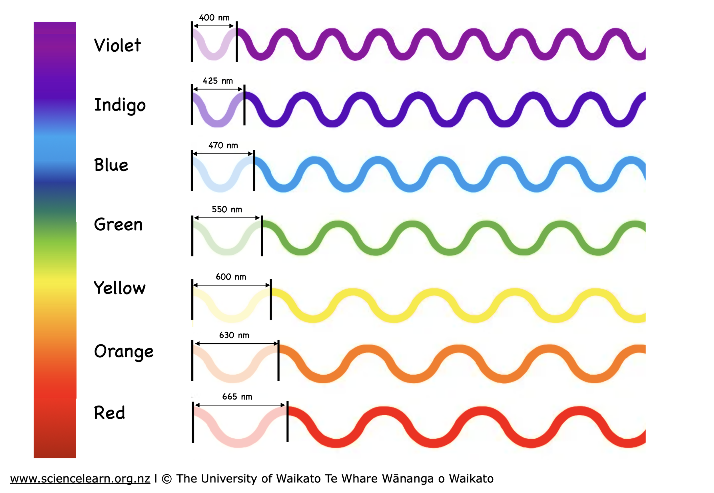Different colours are different forms of light energy. They are produced with different wavelengths and different frequencies. Frequency means how many waves pass a point each second. Short wavelength means high frequency. Long wavelength means low frequency. This is why red light and violet light behave slightly differently when they pass through substances such as glass.