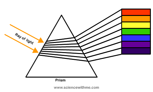 A prism splits white light because of refraction. Refraction means the bending of light when it moves from one material to another, such as from air into glass. Light changes speed when it enters the glass. Each colour changes speed by a slightly different amount because each colour has a different wavelength. This means each colour bends by a different amount. Red bends the least. Violet bends the most. The spreading out of white light into different colours is called dispersion.