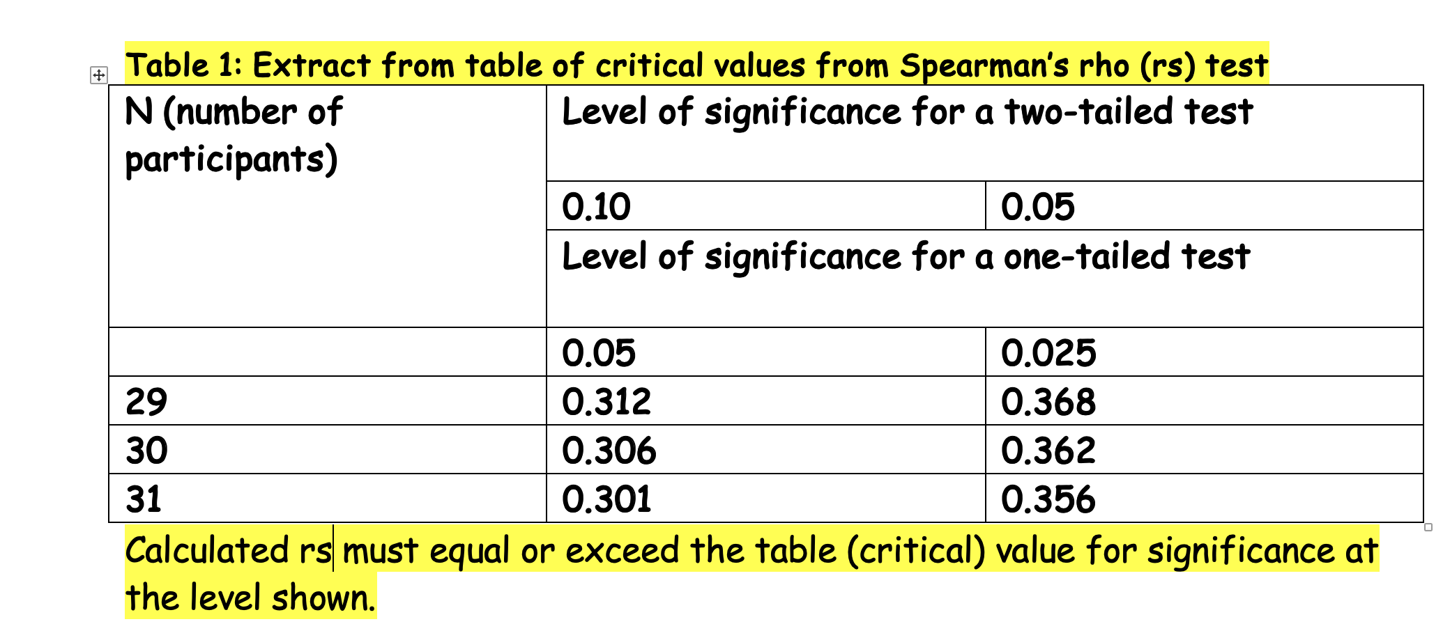 Q1Many students saw the minus sign in -0.52 and treated it as a negative number less than zero. They compared –0.52 directly to the critical value (0.306) and thought “–0.52 is less than 0.306”, so they wrongly concluded the result was non-significant. They did not understand that the minus sign only shows direction and that for significance testing, you must use the absolute value (0.52). The result is significant. The calculated correlation coefficient is rs = -0.52. For N = 30 at the 0.05 level (one-tailed test), the critical value is 0.306. Because the absolute value of the coefficient (0.52) is greater than the critical value (0.52 > 0.306), the result is statistically significant at the 0.05 level.