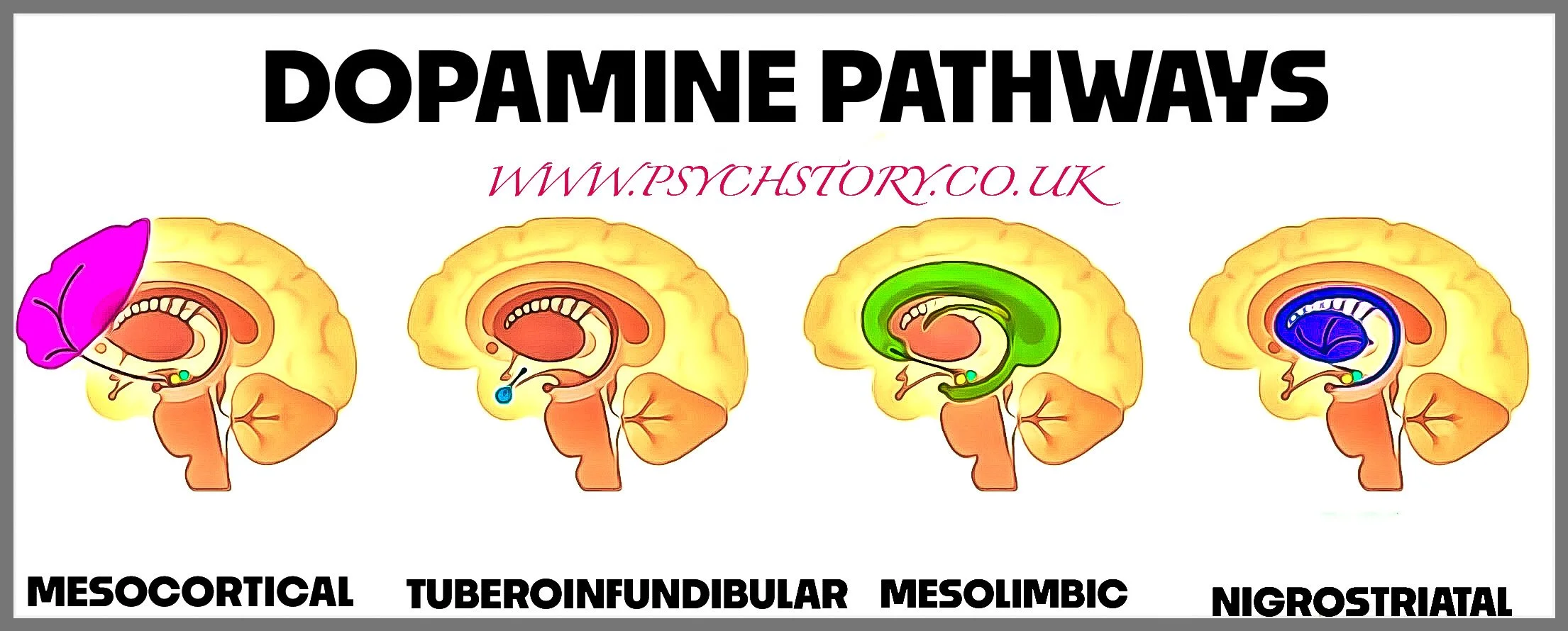 A neural correlate is a change in brain activity, function, or structure that is consistently linked to a specific behaviour or mental state. Genes, disease, epigenetic factors, or environmental influences may cause these differences. For example, people who have difficulty producing speech often show damage to a region in the left frontal lobe known as Broca’s area. This suggests a strong relationship between that brain region and speech output. In clinical psychology, neural correlates are used to identify biological features of mental illness by linking brain abnormalities with patterns of symptoms. While correlations alone do not prove cause and effect, in many cases — especially where brain damage leads to an apparent behavioural change — a causal relationship is strongly supported by converging evidence. A neural correlate for schizophrenia is a physical difference in the brain that is linked to the symptoms of the disorder. It refers to specific, observable features in brain structure or activity that consistently occur in people with schizophrenia. Research has identified many neural correlates for schizophrenia, meaning areas of brain damage or differences that correspond with schizophrenic behaviour. However, because this is a large area, AQA requires you to focus on the dopamine hypothesis as the neural correlate to discuss in your essay. The best-established neural correlate of positive symptoms (hallucinations, delusions) is excess dopamine in the mesolimbic pathway that overstimulates D2 receptors. At the same time, too little dopamine reaching the prefrontal cortex (mesocortical hypo-dopaminergia) is the main biological driver of negative and cognitive symptoms such as avolition, flat affect, and speech poverty. Together, these opposite imbalances in different brain pathways form the modern dopamine hypothesis and remain the single most crucial biochemical explanation for schizophrenia.